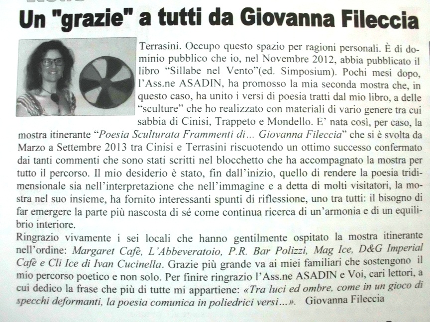 16/01/201505/01/2022Giovanna Fileccia Articoli per La Gru News Scopri di più da GIOVANNA FILECCIA Io e il Tutto che mi attornia Abbonati per ricevere gli ultimi articoli inviati alla tua e-mail. Digita la tua e-mail... Iscriviti Condividi: Fai clic per condividere su Facebook (Si apre in una nuova finestra) Facebook Fai clic per condividere su WhatsApp (Si apre in una nuova finestra) WhatsApp Fai clic per condividere su X (Si apre in una nuova finestra) X Fai clic qui per condividere su Pinterest (Si apre in una nuova finestra) Pinterest Fai clic qui per stampare (Si apre in una nuova finestra) Stampa Fai clic per inviare un link a un amico via e-mail (Si apre in una nuova finestra) E-mail Altro Fai clic qui per condividere su LinkedIn (Si apre in una nuova finestra) LinkedIn Fai clic qui per condividere su Tumblr (Si apre in una nuova finestra) Tumblr Fai clic qui per condividere su Reddit (Si apre in una nuova finestra) Reddit Fai clic qui per condividere su Pocket (Si apre in una nuova finestra) Pocket Fai clic per condividere su Telegram (Si apre in una nuova finestra) Telegram Mi piace Caricamento... Correlati