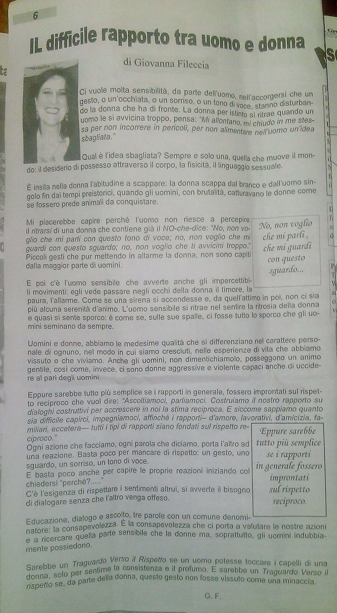 Eppure sarebbe tutto più semplice se i rapporti in generale, fossero improntati sul rispetto reciproco che vuol dire: “Ascoltiamoci, parliamoci. Costruiamo il nostro rapporto su dialoghi costruttivi per accrescere in noi la stima reciproca. E siccome sappiamo quanto sia difficile capirci, impegniamoci, affinché i rapporti– d’amore, lavorativi, d’amicizia, familiari, eccetera— tutti i tipi di rapporti siano fondati sul rispetto reciproco.”