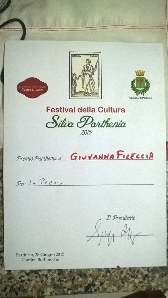 TRA le personalità che hanno ricevuto il riconoscimento ‘Silva Parthenia’ -per l’impegno che hanno nel divulgare e vivacizzare la cultura nel nostro territorio- ci sono anche io. Ringrazio la bravissima attrice che ha letto le mie poesie ‘Metafore’ e ‘Sillabe nel vento’.