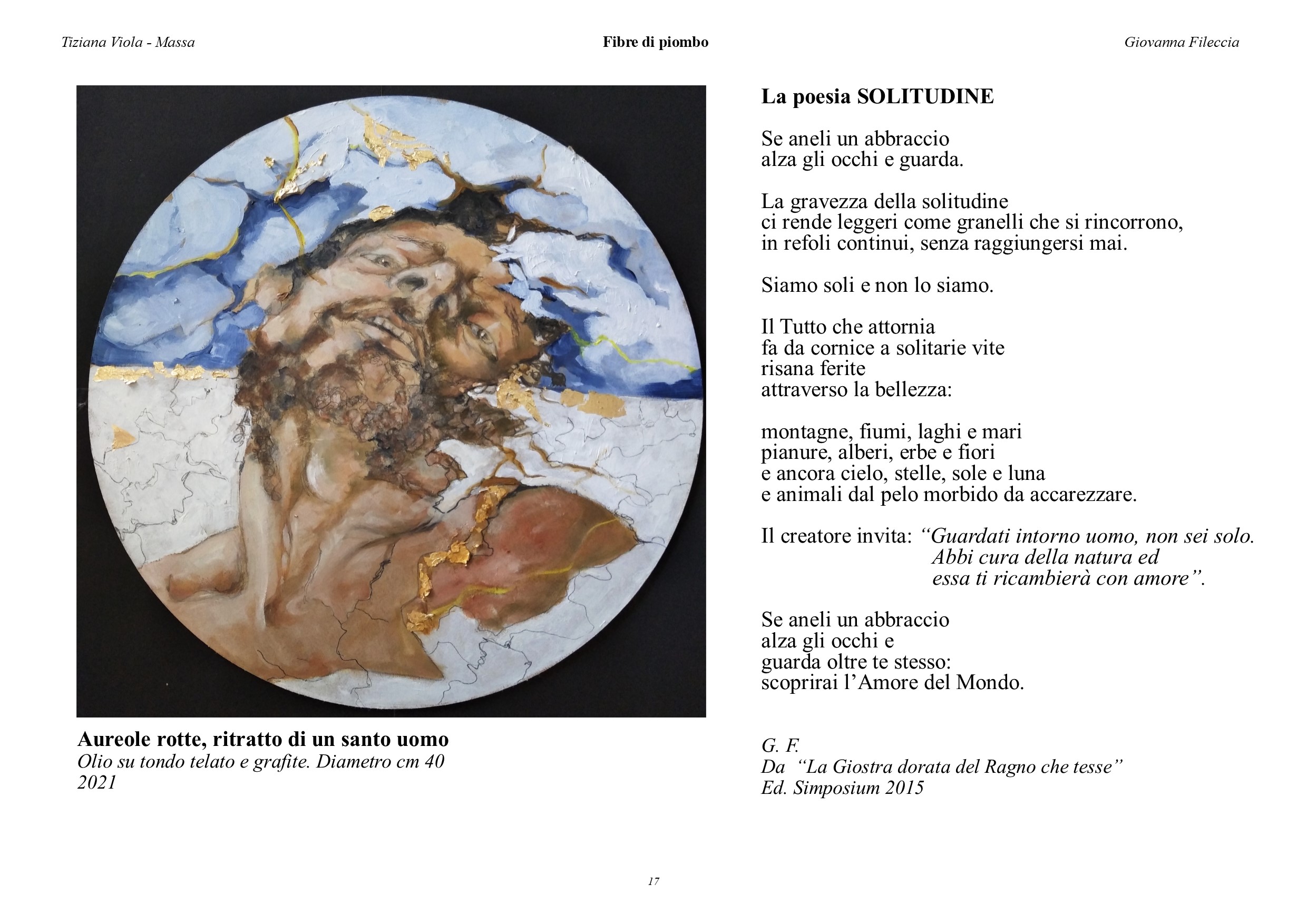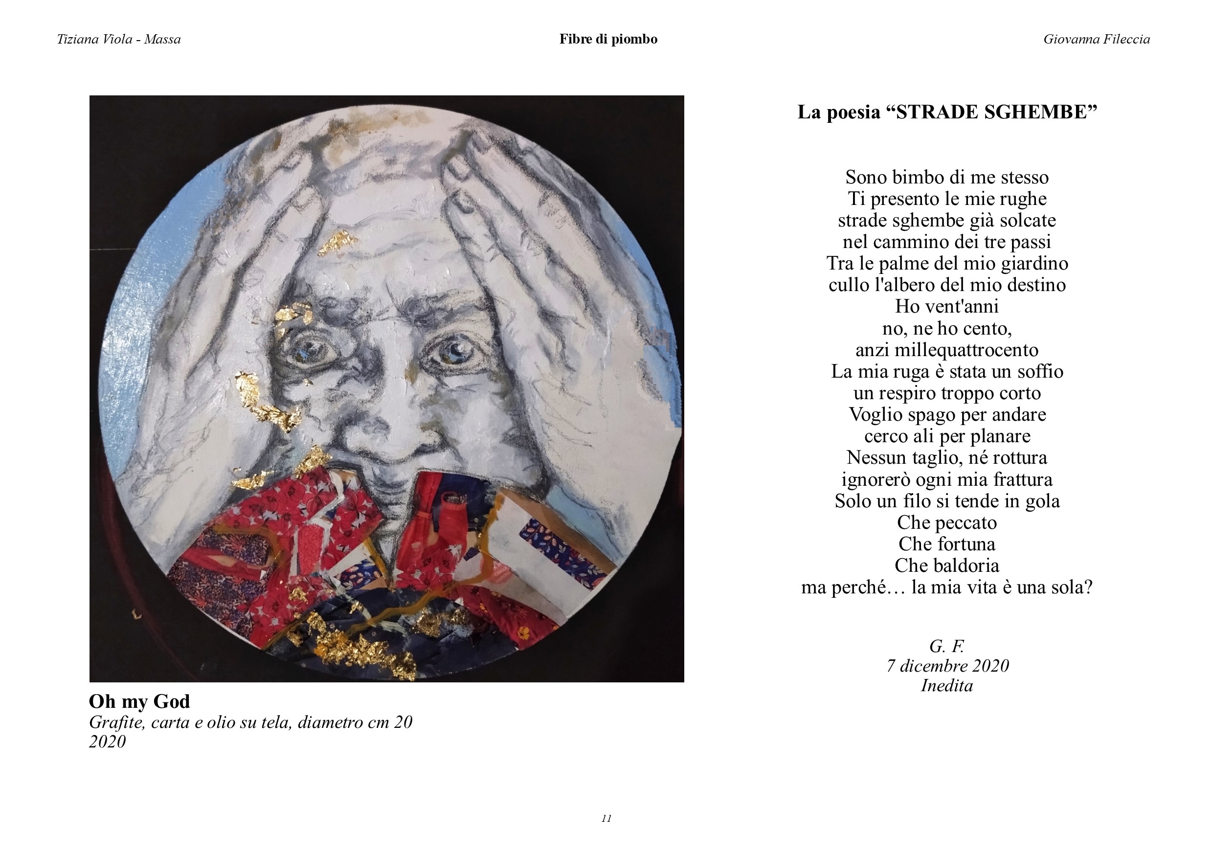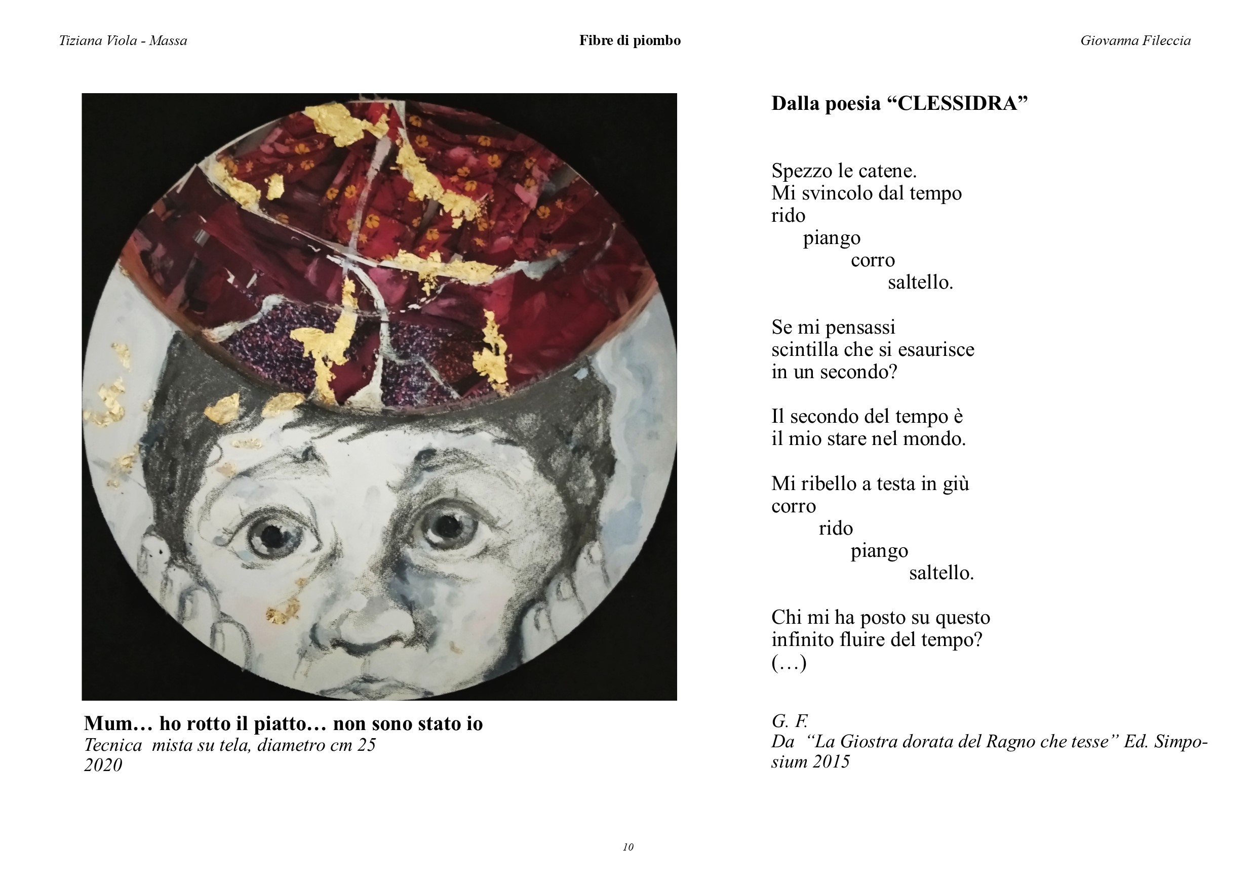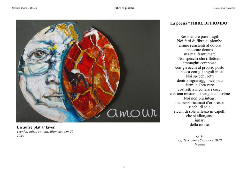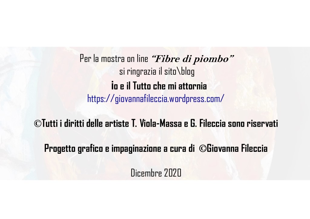 Sabato 23 gennaio 2021 è terminata la mostra on line Fibre di piombo, opere di Tiziana Viola-Massa e poesie di Giovanna Fileccia. Il prossimo allestimento della mostra sarà in presenza e sarà arricchito da altre nuove opere e poesie. Ma ciò avverrà quando la morsa pandemica allenterà il suo artiglio.