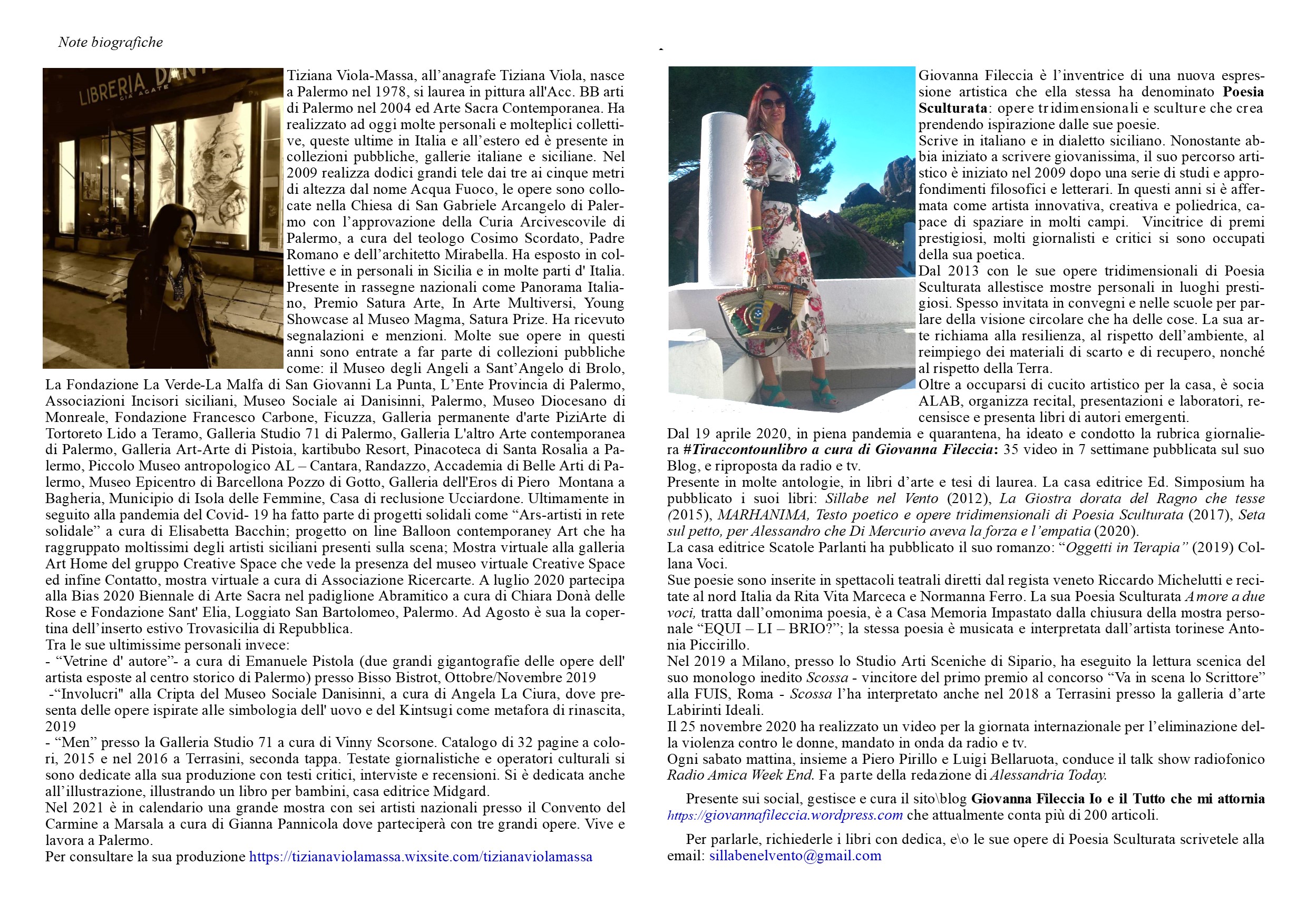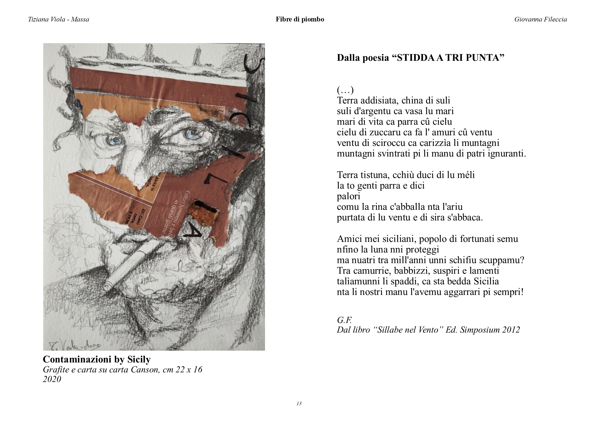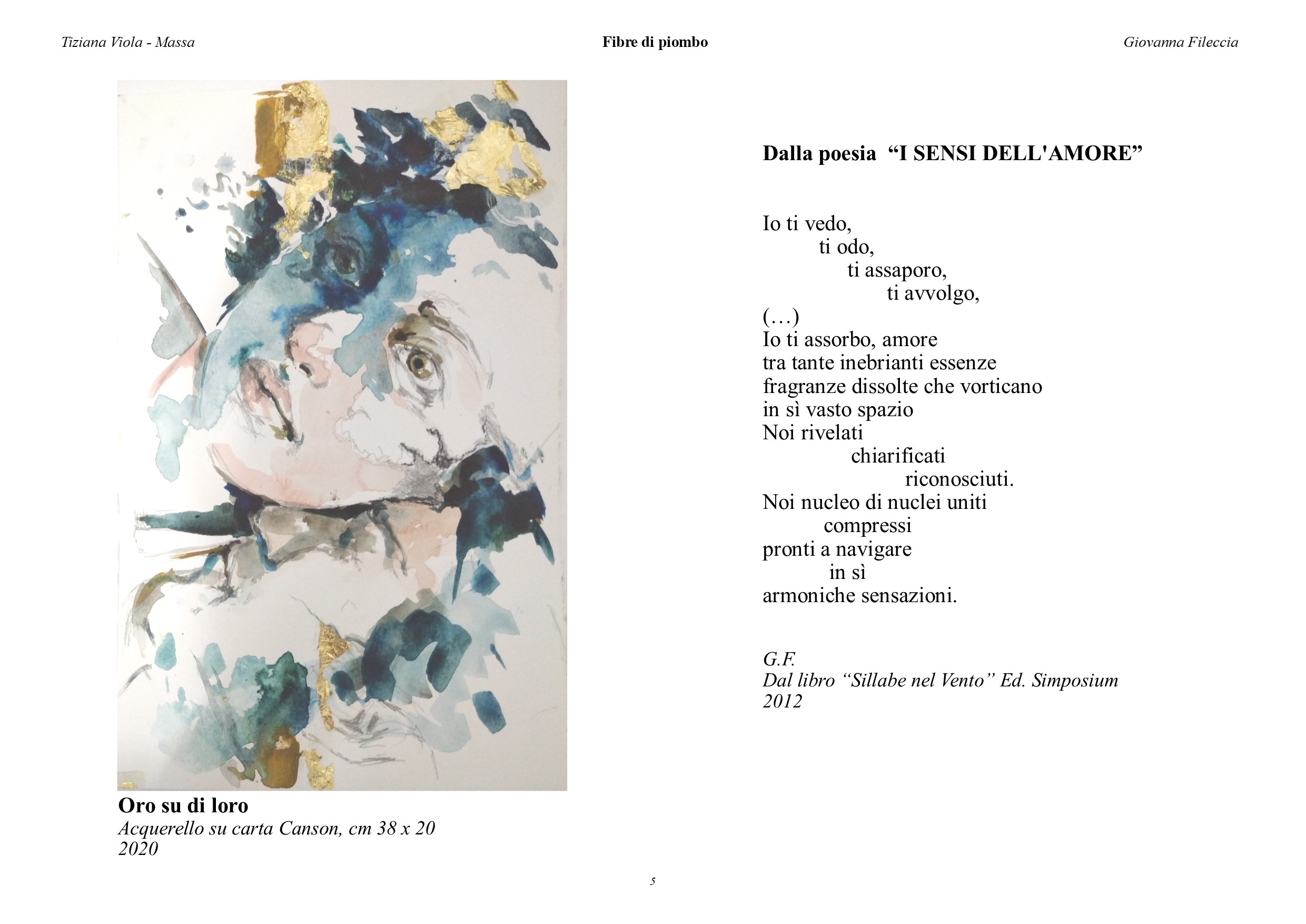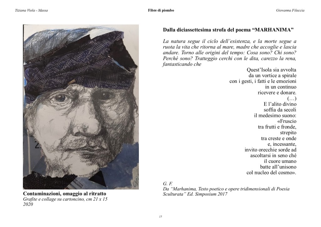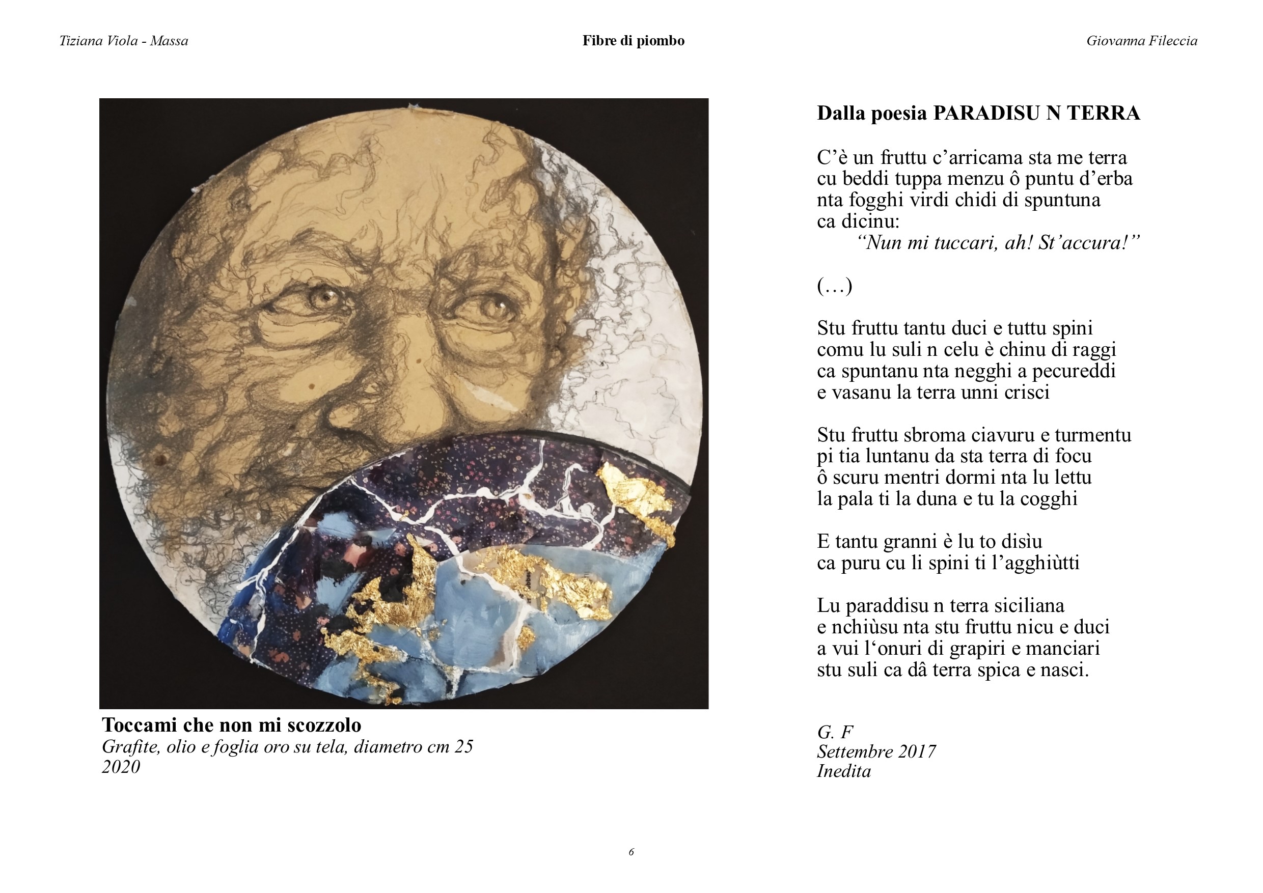 Sabato 23 gennaio 2021 è terminata la mostra on line Fibre di piombo, opere di Tiziana Viola-Massa e poesie di Giovanna Fileccia. Il prossimo allestimento della mostra sarà in presenza e sarà arricchito da altre nuove opere e poesie. Ma ciò avverrà quando la morsa pandemica allenterà il suo artiglio.