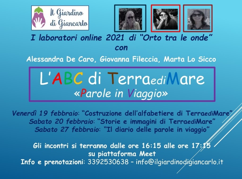 Attendiamo voi e i vostri bambini agli incontri online “L’ABC di TerraediMare, Parole in Viaggio” il 19, il 20 e il 27 febbraio 2021 dalle 16.15 alle 17.15.