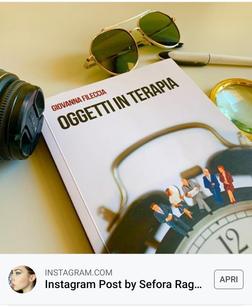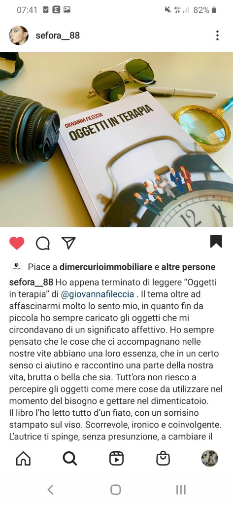 Ho appena terminato di leggere “Oggetti in terapia” di Giovanna Fileccia. Il tema oltre che affascinarmi molto lo sento mio, in quanto fin da piccola ho sempre caricato gli oggetti che mi circondavano di un significato affettivo. Ho sempre pensato che le cose che ci accompagnano nelle nostre vite abbiano una loro essenza, che in un certo senso ci aiutano e raccontino una parte della nostra vita, bella o brutta che sia. Tutt’ora non riesco a percepire gli oggetti come mere cose da utilizzare nel momento del bisogno e gettare nel dimenticatoio. Il libro l’ho letto tutto d’un fiato, con un sorrisino stampato sul viso. Scorrevole, ironico e coinvolgente. L’autrice ti spinge, senza presunzione, a cambiare il modo di relazionarsi alle cose. Non vuole importi un insegnamento ma vuole darti uno spunto di riflessione, il tutto in maniera fiabesca. Infine, trovo avvincente la scelta di introdurre ogni capitolo con una citazione che ti catapulta direttamente nello stesso.
