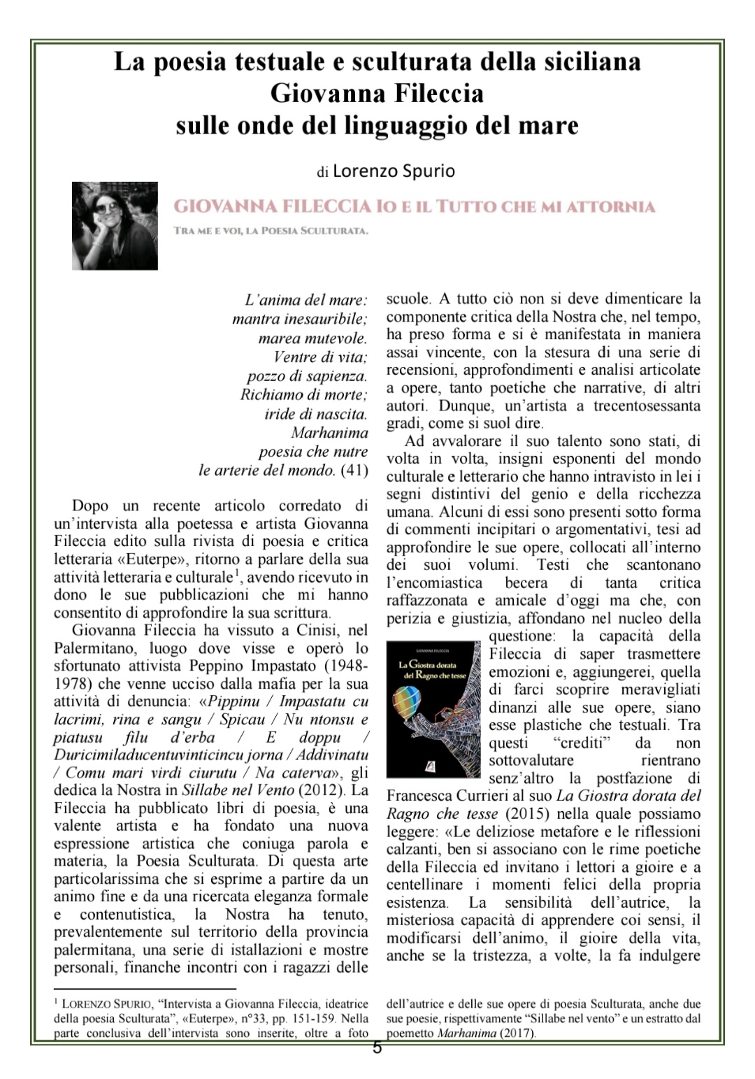Una sorpresa gradita mi arriva dal poeta, saggista e critico letterario Lorenzo Spurio che ringrazio molto: un suo saggio su tre dei miei libri dal titolo “La poesia testuale e sculturata della siciliana Giovanna Fileccia nel linguaggio delle onde del mare”.