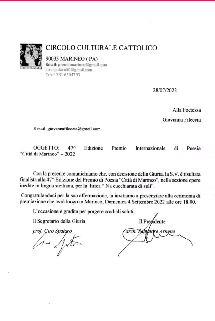 Condivido il link dell’articolo con tutti i vincitori del prestigioso premio. Complimenti a tutti: https://marineo.wordpress.com/2022/08/04/designati-i-vincitori-del-47-premio-citta-di-marineo-a-ennio-cavalli-il-premio-per-la-poesia-ed-a-claudio-gioe-il-premio-speciale/