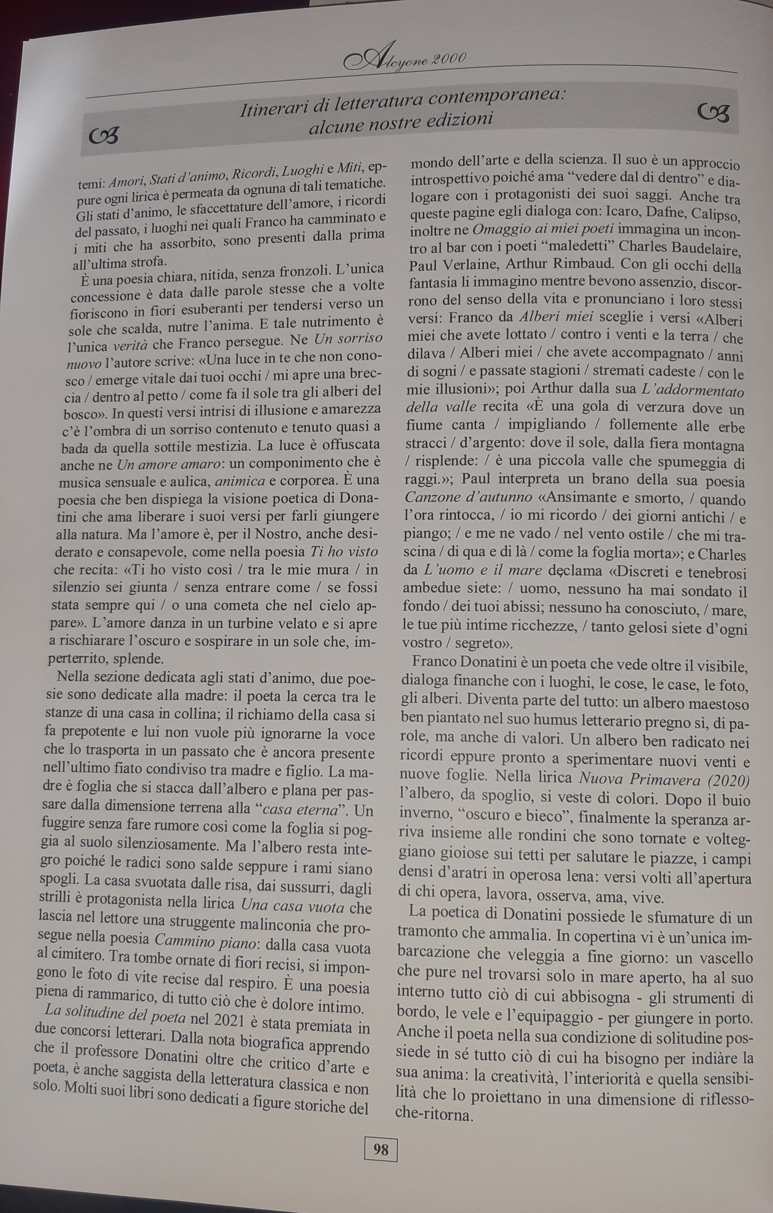 La scrittura di Franco Donatini risulta fluida e, seppure la punteggiatura sia -quasi- assente, le strofe risultano cadenzate da un ritmo musicale che rende la lettura armoniosa. L’unico segno di punteggiatura che Franco utilizza sono i tre puntini che creano la sospensione e il pathos. La raccolta La solitudine del poeta è divisa nelle seguenti sezioni che ne determinano i temi: Amori, Stati d’animo, Ricordi, Luoghi e Miti, eppure ogni lirica è permeata da ognuna di tali tematiche. Gli stati d’animo, le sfaccettature dell’amore, i ricordi del passato, i luoghi nei quali Franco ha camminato e i miti che ha assorbito, sono presenti dalla prima all’ultima strofa.