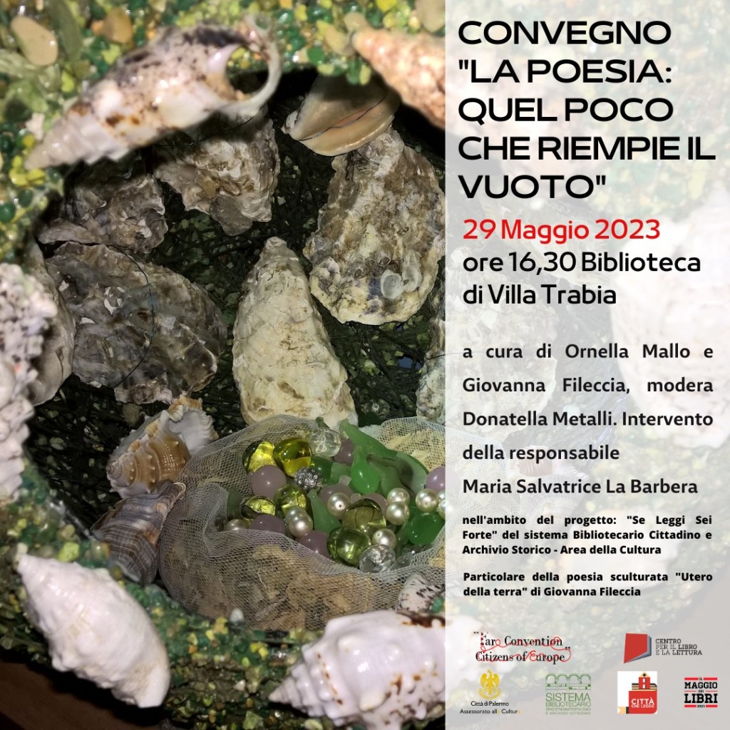 Palermo. Il convegno “La Poesia: quel poco che riempie il vuoto” partecipa alla Campagna Nazionale di Promozione della lettura “Il Maggio dei libri” Edizione XIII organizzata dal Cepell, che vedrà la partecipazione delle poetesse Giovanna Fileccia e Ornella Mallo presso la Biblioteca Villa Trabia lunedì 29 maggio 2023 alle ore 16.30. L’incontro sarà moderato dalla dott.ssa Donatella Metalli. Saluteranno i lavori la responsabile della biblioteca Dott.ssa Maria Salvatrice La Barbera e il Presidente Arch. Rosa Anna Argento. L’evento dell’Associazione Faro Convention- Citizens of Europe e promosso dall’Assessorato alla Cultura e dal Sistema Bibliotecario Comunale ha inteso dare un contributo al tema istituzionale della tredicesima edizione “Se leggi sei forte!” con la valorizzazione della poesia, in quanto portatrice di contenuti.
