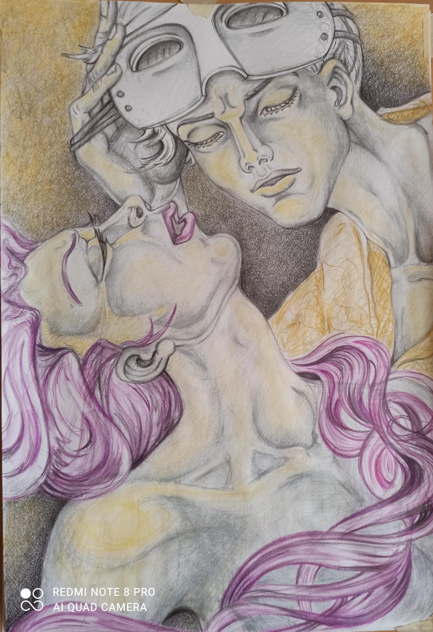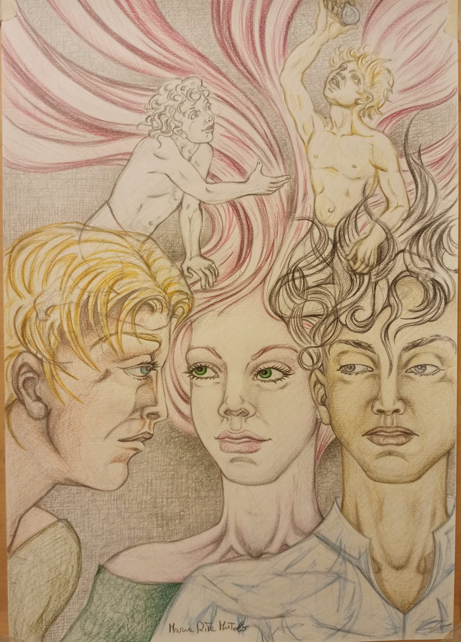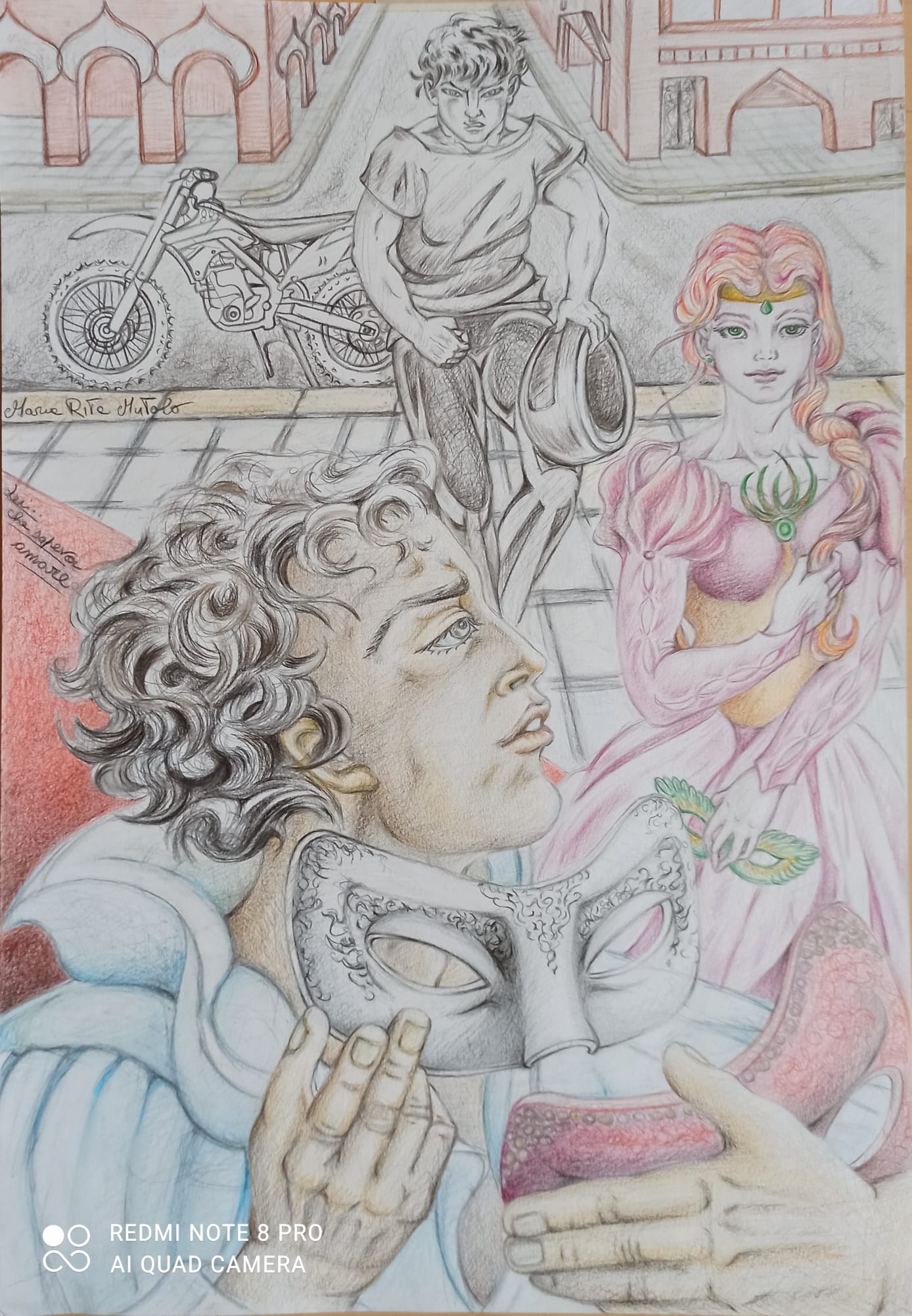 In due per lei è edito da L’Inedito, una realtà dove gli autori sono fili di corde capaci di unirsi anche a distanza. La copertina del romanzo di Maria Rita Mutolo è di Maurizio Bellesso e rende l’idea dell’autrice poiché i tre protagonisti sono uniti da un filo nero. Si spezzerà il filo, oppure verrà riannodato? In attesa della risposta che arriverà a lettura conclusa, mi appresto svelare un aspetto della nostra autrice la quale per il suo romanzo ha illustrato alcune tavole. Ella maestro d’arte ha visto le scene e le ha rese reali con la pittura e il disegno. Ha dato colore e tratti ai visi dei tre protagonisti, ha immaginato agli abiti nei minimi dettagli: i costumi di Giulietta e Romeo per i due fidanzati, invece per Giorgio l’abito perfetto per lui: il Fantasma dell’opera, una figura che c’è e allo stesso tempo… non c’è.