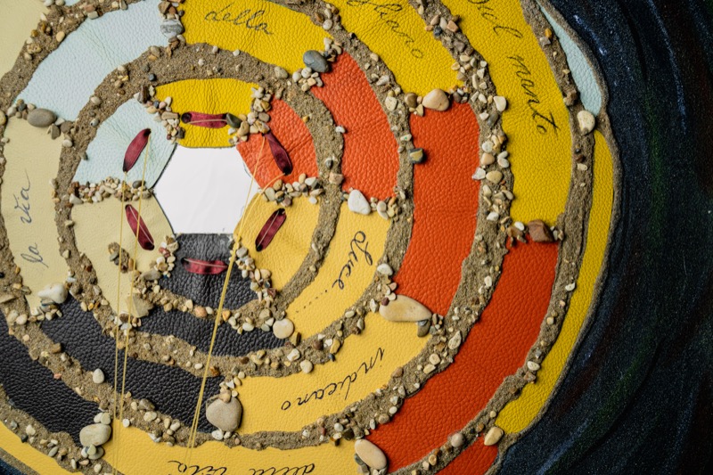 Nel volere tras-portare i vari strati verso l’esterno attuo, più o meno cosciente e in un ordine apparente e intercambiabile, delle costanti che circolari si muovono in sincrono e anelano all’equilibrio. La pluristratificazione è, in questo caso, sia ideale che materiale: sillabe che si intrecciano ed elementi materici che si amalgamano. Il messaggio che nasce ha anch’esso più strati e, nonostante si dipani in svariate direzioni, nasce dall’interiorità per espandersi all’esterno come tante frecce che seguono vie che conoscono e che sconoscono.