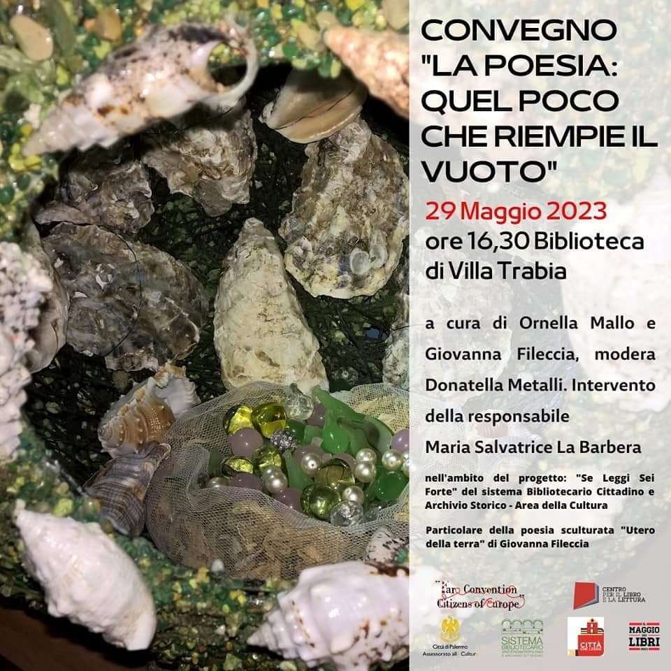 - A maggio 2023, per il Maggio dei Libri, ha partecipato ad un Convegno sulla poesia promosso dall’associazione Faro Convention Citizen Of Europe dal titolo “La poesia: quel poco che riempie il vuoto”. In locandina un particolare della sua opera di Poesia Sculturata Utero della Terra-Marhanima che è stata esposta per tutta la durata del convegno. Due parole su quest’opera. (allega foto)