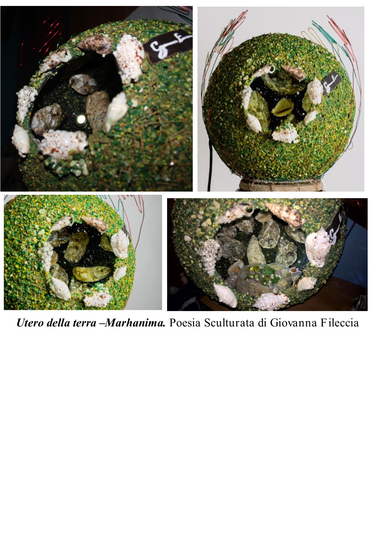 Trascrivo un brano dal mio intervento dal titolo Ritorno al vuoto dove parlo anche della Poesia Sculturata Utero della Terra-Marhanima: “(…) Ma com’è il vuoto? Io lo immagino come una sfera all’altezza dell’esofago che contiene già il sé più prezioso in viaggio verso l’esterno, affinché mani invisibili si aggrappino alla pienezza del vivere e la sfera trasli e raggiunga la vetta dell’anima, un’anima che, seppure piena di tagli, va verso la luce. È strano come ciò che ho appena detto mi riporti alla mia opera di Poesia Sculturata “Utero della terra-Marhanima” la quale ha, al suo interno, le preziosità più segrete: quelle che attengono all’anima. In “Utero della terra” la sfericità si fa contenuto e contenitore e al suo interno vi si accede con la reverenza di chi si predispone ad accoglierne il segreto: oltre la soglia, la sfera è completa, piena e si palesa quasi con sfrontatezza poiché essa sa, conosce ciò che è inconoscibile. Eppure è sufficiente saltare –con coraggio- nel vuoto per accedere alla luce. La poesia, quindi, me la figuro come un utero da riempire con le unicità del cosmo e… dell’uomo. (…)”.