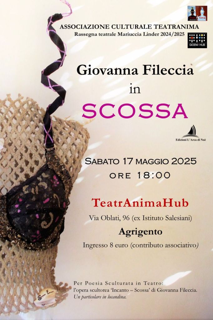 Sabato 17 maggio 2025, alle ore 18:00, nella sala del TeatranimaHub, il nuovo centro culturale realizzato dalla Associazione Culturale TeatrAnima, all’interno dell’ex Istituto Salesiani di Via Oblati 96 – Agrigento, per la rassegna teatrale 2024 / 2025 “Mariuccia Linder”, andrà in scena il monologo “Scossa”, interpretato dalla stessa Giovanna Fileccia. Per Poesia Sculturata in Teatro Giovanna Fileccia utilizzerà la sua opera “Incanto” come oggetto di scena.
