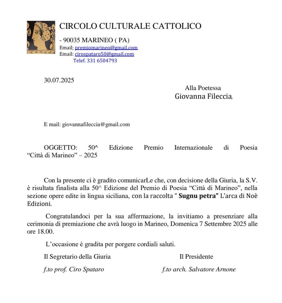 Sono molto felice di annunciare che per la terza volta sono premiata al prestigioso Premio Internazionale di Poesia “Città di Marineo”, quest’anno giunto alla 50a edizione e considerato uno dei più importanti nel panorama letterario.